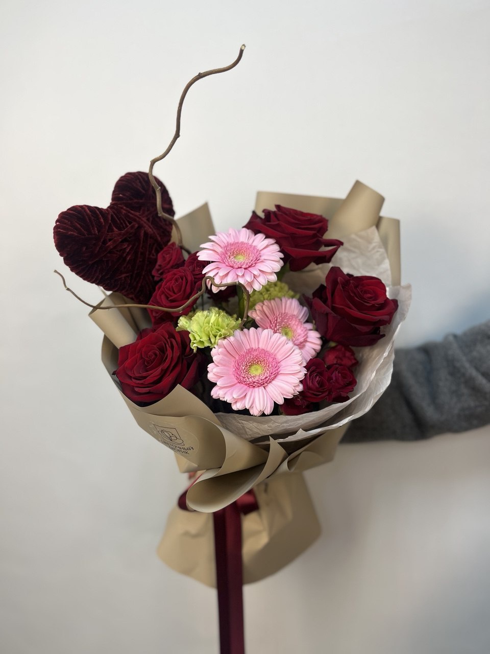 РОЗА Эквадор "Эксплоурер" 3шт, гермини 3шт, диантус 2шт, кустовая роза 2шт, корелиус 2 ветки, декор сердце 1шт