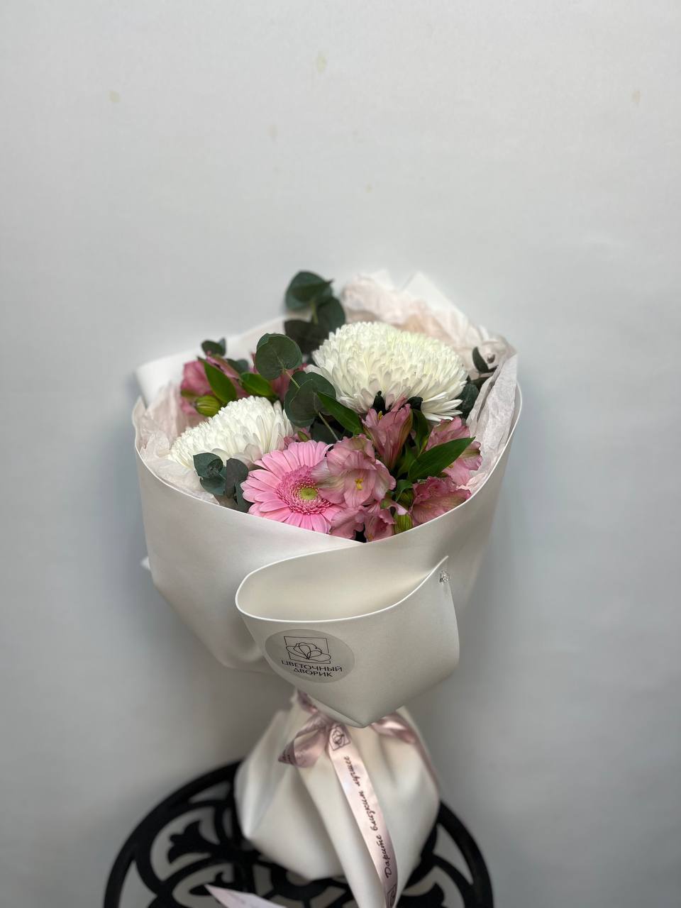 Хризантема одноголловая Антонов 2шт, гермини розовая 1шт, альстромерия розовая 1шт