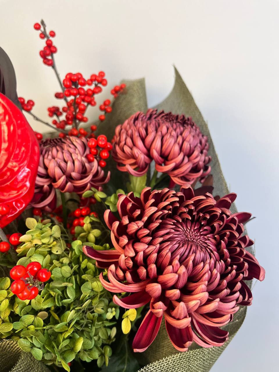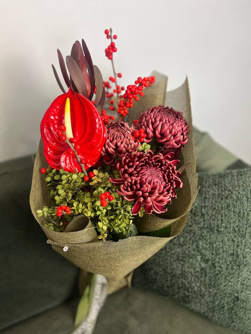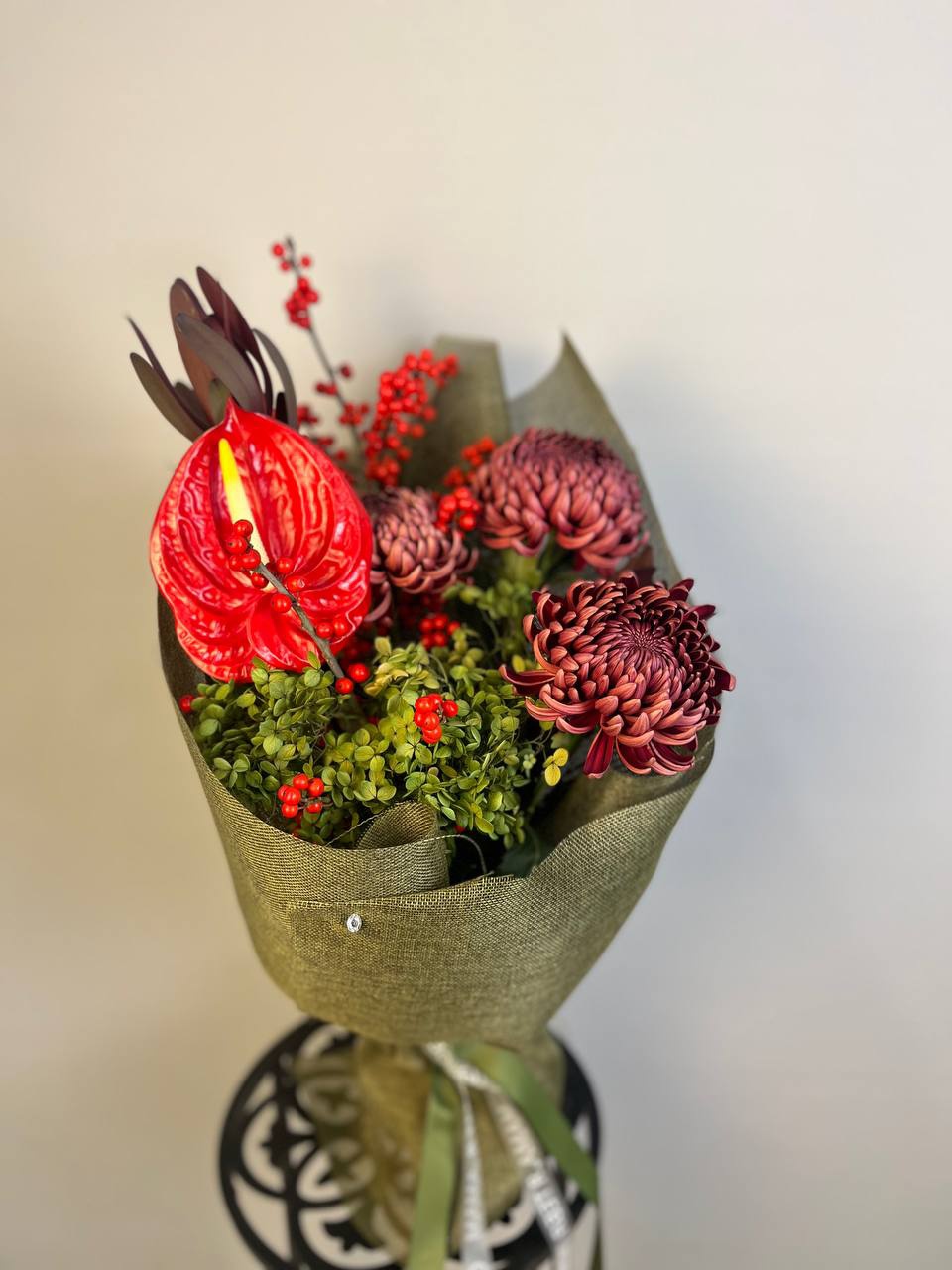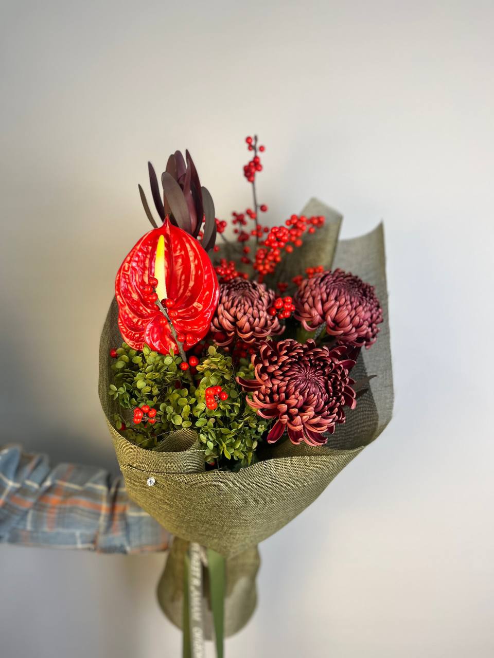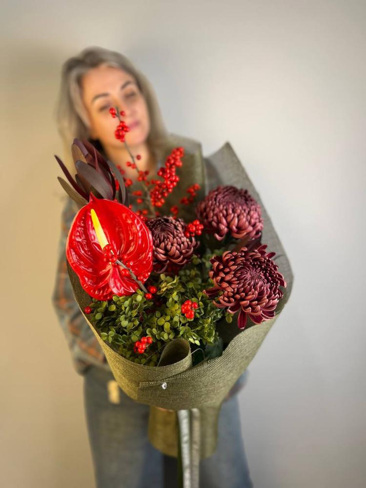 Хризантема бигуди 3шт, антуриум красный 1шт, ветка илекс 1шт, гортензия стабилизированная зелёная 1шт, леукодендрон 2шт