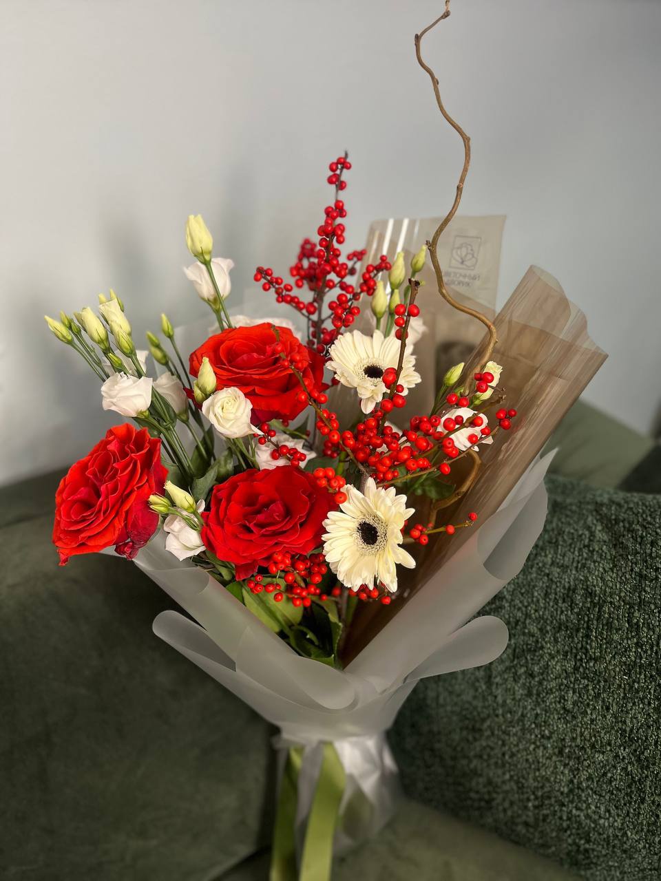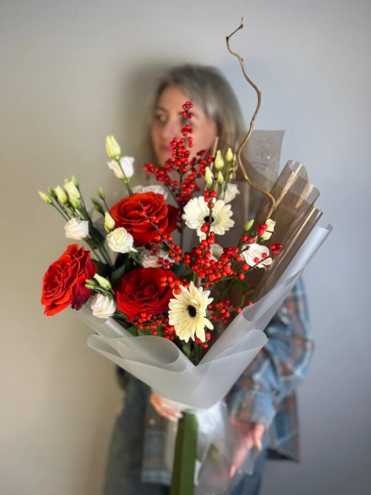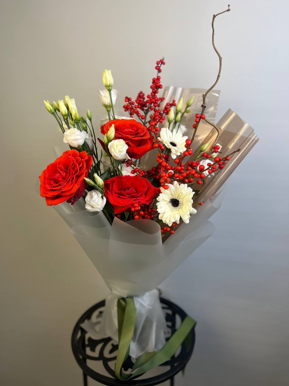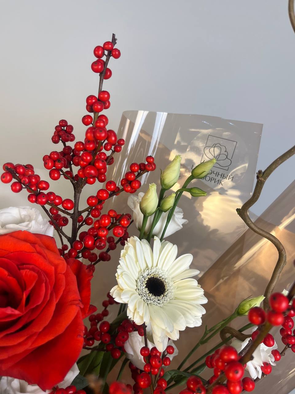 Роза эквадо "Нина" 3шт , гермини 2шт, Илекс красный 2 ветки, корелиус 1ветка. эустома 2штДополнительно