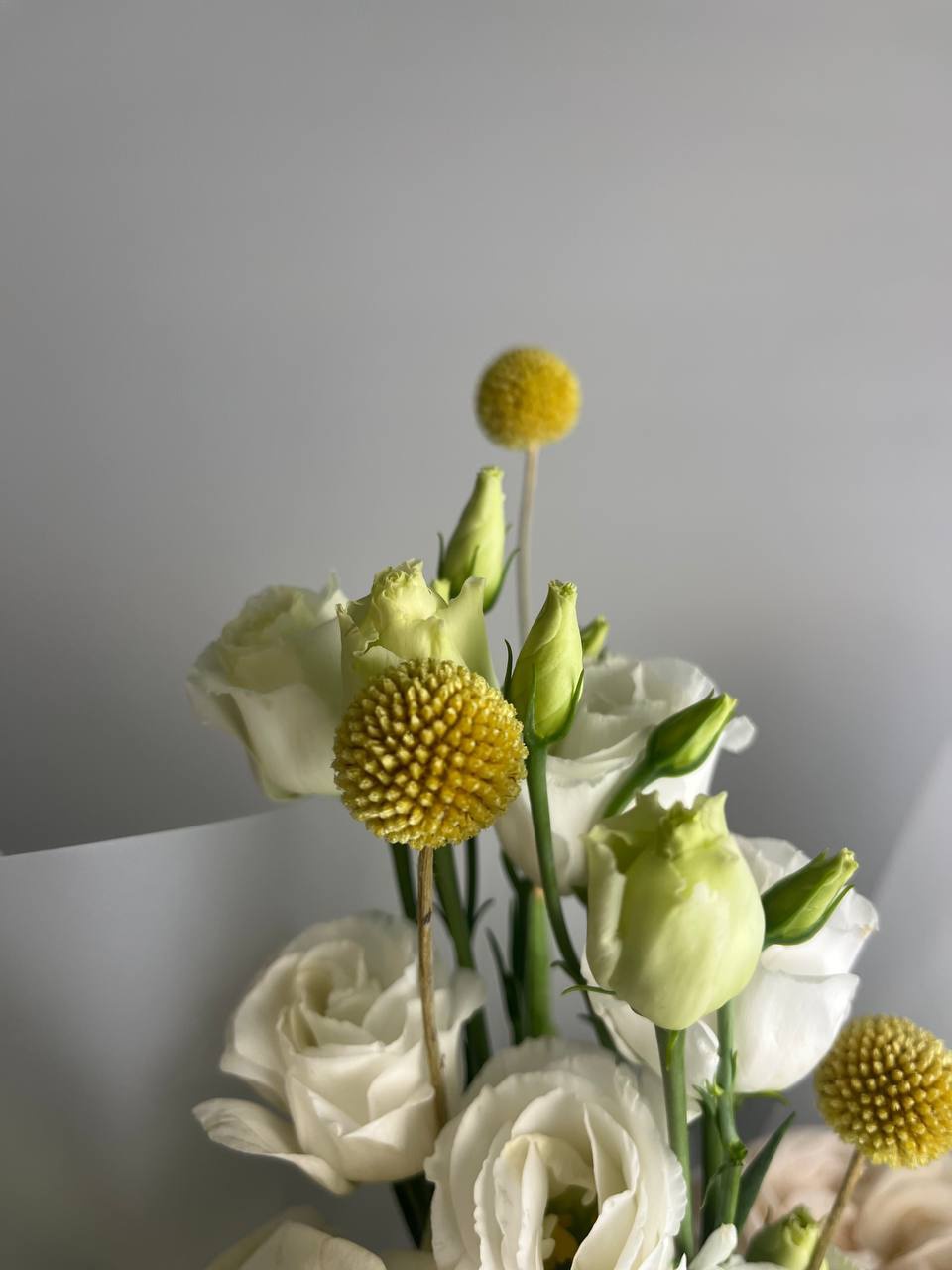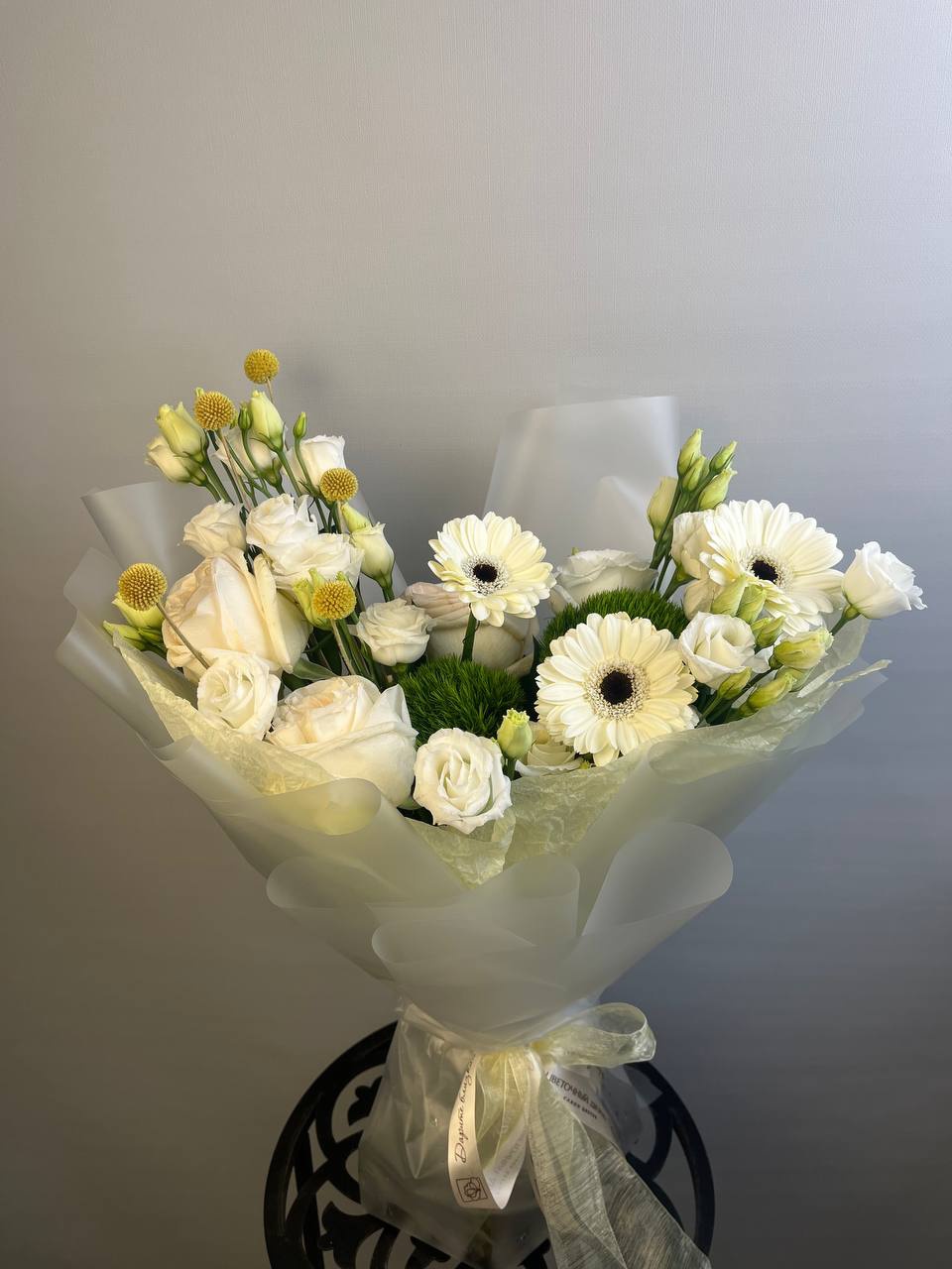 гермини 3шт, эустома 2шт, роза эквадор 3шт, краспедия 2шт, гвоздика зелёная 2шт,Дополнительно