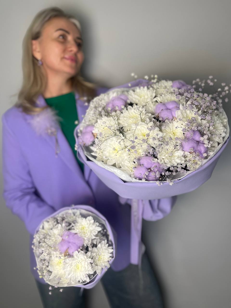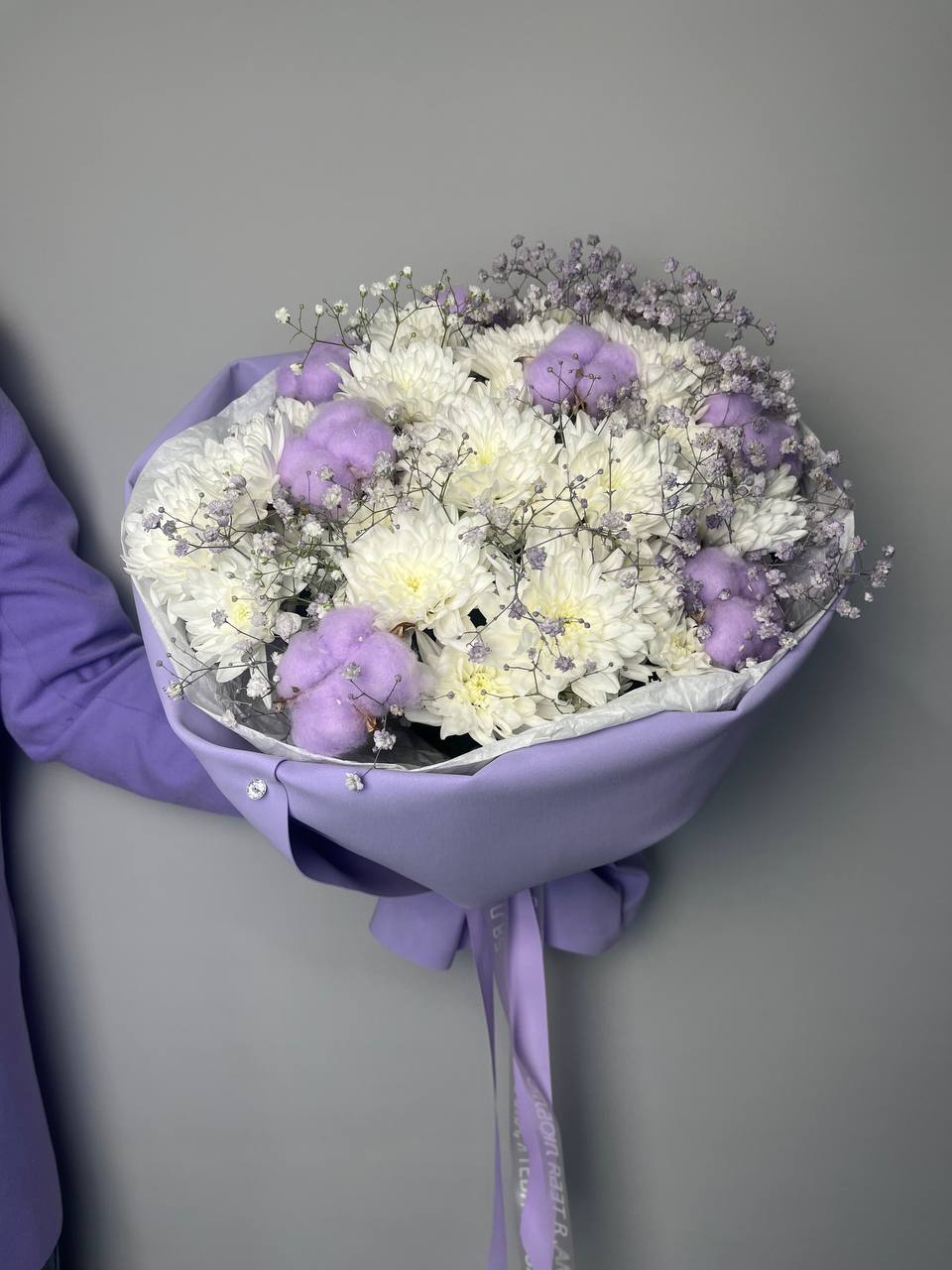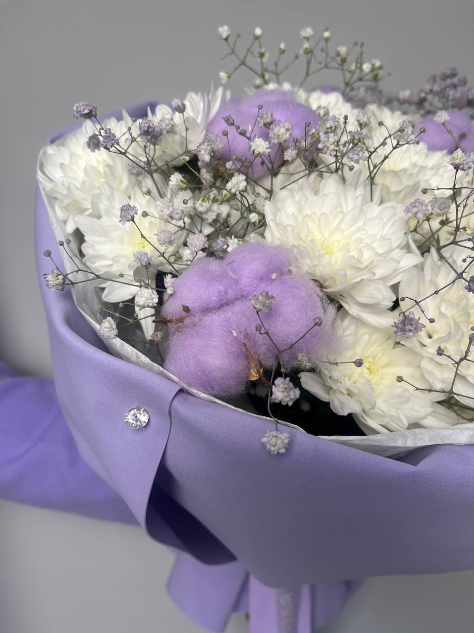 Хризантема кустовая белая 5шт, гипсофила цветная 4шт, хлопок 7шт,Дополнительно